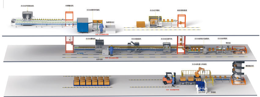 一樓:滾筒輸送設備、供棧機、全自動(dòng)機器人碼垛機。